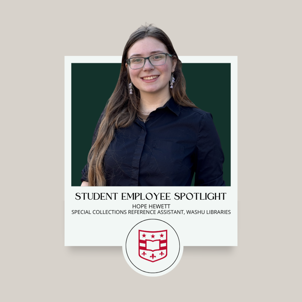 If you’re reading this and thinking to yourself, I didn’t know WashU Libraries have special collections, and I didn’t know students could work there! then you’re in the same place Hope Hewett was in three years ago when she first visited the Special Collections. “I visited Special Collections in my first-year college writing class and thought it was super cool!” explains Hewett. “I set up a meeting with their staff to talk about paths to jobs in libraries and was excited about the possibilities. So, when applications for student positions opened, I knew I wanted to apply.”