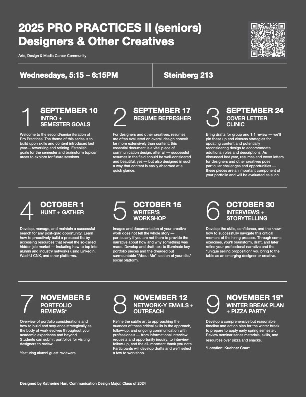 Communication Design is a very broad umbrella term for an enormous number of industry niches — from traditional graphic design (publications, type design, paper, brand identity systems) to image-making (editorial illustration, animation, storyboarding) to exhibition and environmental design to interaction design, an area that’s seen exponential growth in the last decade. Be sure to join the WashU Communication Design Network — almost 1,000 practitioners working across the discipline and practice of design — alums sharing job openings and professional development opportunities with both students and one another.